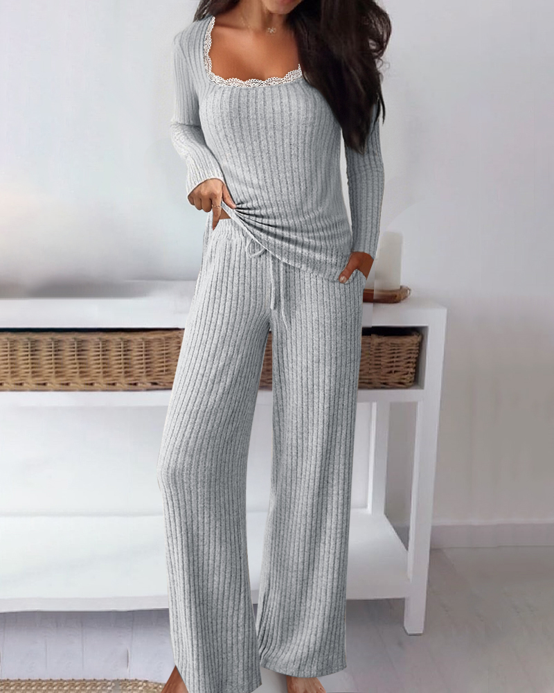 2-teiliges Outfit-Set mit Spitzenbesatz, quadratischem Ausschnitt, langärmligem Oberteil und Hose mit Kordelzug und elastischer Taille, lässiges Set aus gebürstetem Rippenmuster mit Taschen