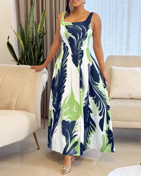 Kleid mit abstraktem Print, breiten Trägern und eckigem Ausschnitt, lässiges, fließendes A-Linien-Maxikleid