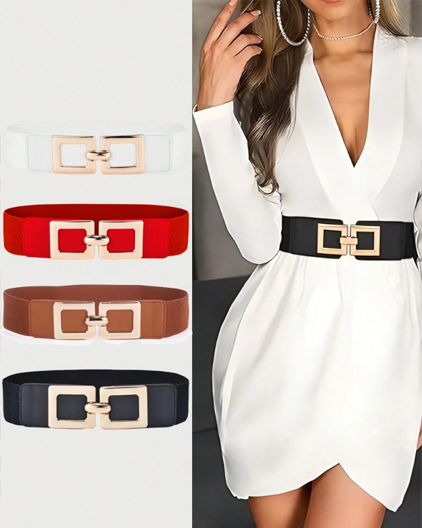 Wide Elastic Belt Fashion Square Gold Buckle Stretch Dress Belt Waistband