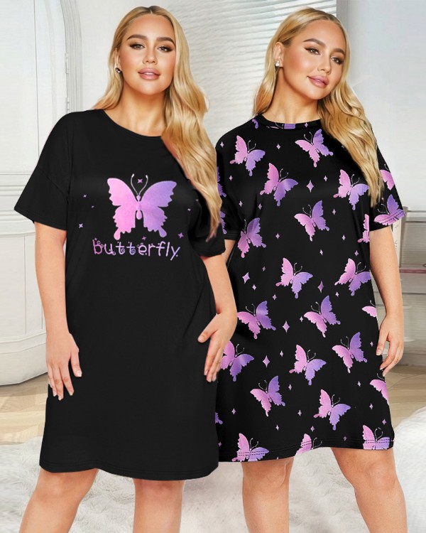 2 PCS Plus Size Butterfly Pattern Short Sleeve Mini Dress Casual Nightgowns