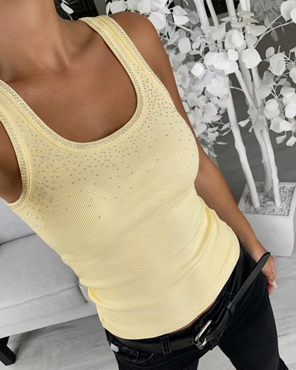 Strassilla koristeltu U-aukkoinen hihaton, vartalonmyötäinen joustinneulospaita