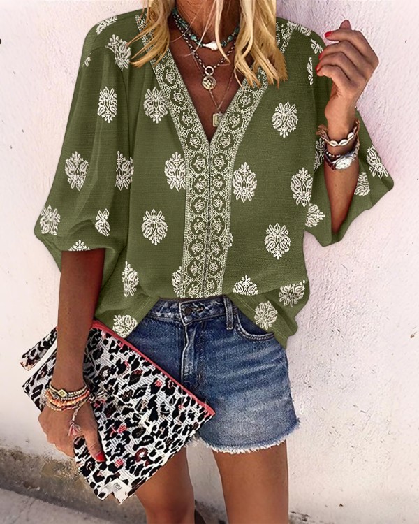 Vintage Baroque Placement Print V-Neck Lantern Sleeve Blouse Casual Long Sleeve Loose Fit Boho Top